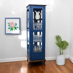 - 01 Cristaleira de Madeira 1 Porta 1 Gaveta 3 Prateleiras Lateral com Vidro Fundo de Espelho Pés Luiz XV
