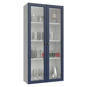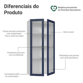 O acabamento fosco de alta resistência da estrutura é em Branco e das portas em Azul, refletindo o estilo americano com um toque moderno. Possui uma textura suave ao toque, trazendo leveza e sofisticação ao ambiente. O destaque vai para os puxadores ponto em ouro envelhecido, feitos com metal resistente, que adicionam personalidade e um charme único.