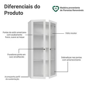 O acabamento fosco de alta resistência da estrutura e das portas é em branco, refletindo o estilo americano com um toque moderno. Possui uma textura suave ao toque, trazendo leveza e sofisticação ao ambiente. O destaque vai para os puxadores ponto em ouro envelhecido, feitos com metal resistente, que adicionam personalidade e um charme único.