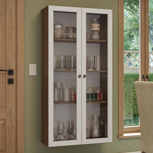 Esta versão foi projetada para instalação suspensa na parede, acompanhando um kit de fixação, que possibilita ajustar a altura da cristaleira conforme sua preferência, garantindo praticidade e otimização do espaço.