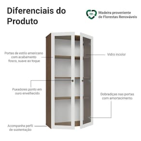 O acabamento fosco de alta resistência da estrutura é em amadeirado Rustic e das portas em Branco, refletindo o estilo americano com um toque moderno. Possui uma textura suave ao toque, trazendo leveza e sofisticação ao ambiente. O destaque vai para os puxadores ponto em ouro envelhecido, feitos com metal resistente, que adicionam personalidade e um charme único.