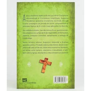 Esta obra é a continuação de Cristianismo descomplicado e Cristianismo simplificadoComo o tema da série sugere,ela tem como objetivo responder,de maneira fácil,simples e compreensível,perguntas que os cristãos e o público em geral fazem acerca de Deus,da Bíblia,das pessoas,do mundo,da Igreja e do futuroAs perguntas foram selecionadas entre as centenas respondidas no programa Em poucas palavras,veiculado inicialmente por uma emissora de rádio de Goiânia cidade em que,na época,eu pastoreava e,posteriormente,por meio de redes sociais e sites da internetNo programa, encorajávamos o público a nos enviar suas dúvidas e tentávamos responder da maneira mais coloquial possívelDimensoes:20x14x1 cm Marca: MUNDO-CRISTAO