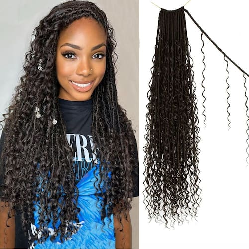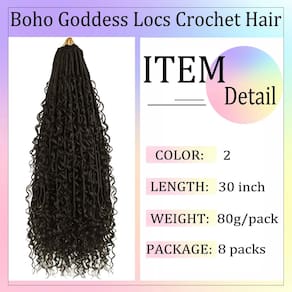 Boho Faux Locs Crochet Hair: Goddess Locs Crochet Hair com pontas encaracoladas como cabelo humano - 1. Pacote: 8 pacotes por lote, 10 fios por pacote, 3 cachos como cabelo humano por fio. Normalmente, 7 pacotes são suficientes para uma cabeça inteira. - 2. Características: cada fio de cabelo de crochê Goddess Locs apresenta três cachos como cabelo humano para um visual completo, natural e bonito. Cada Boho Faux Loc é pré-enrolado para facilitar a instalação de crochê. - 3. Material: Tecnologia de fibra química atualizada, crochê Boho Goddess Locs com o toque encaracolado macio como cabelo humano. Sem cheiro, sem emaranhados, sem queda, textura macia, hipoalergênico. - 4. Garantia: nosso cabelo de crochê macio Goddess Locs oferece uma melhor experiência. Se você não estiver completamente satisfeito com nossos falsos Locs Bohemian River, para obter ajuda. - 5. Estilo: O cabelo de crochê Goddess Bohemian Locs apresenta cachos profundos, deixando seu cabelo mais cheio. Com várias atualizações, é mais leve, mais amigo da pele e mais natural. Seja para um dia da semana, encontro, casamento, Natal, Halloween ou outras ocasiões especiais, você será o centro das atenções!