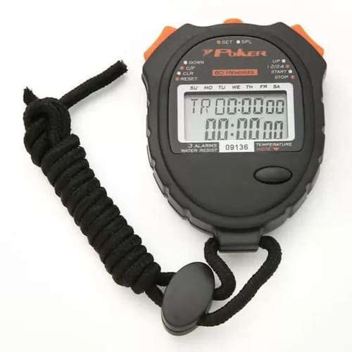 Cronômetro Poker Profissional Running 60 Voltas Digital Cronômetro Poker Profissional Running 60 Voltas DigitalO Cronômetro Profissional Running 60 Voltas Digital possui um excelente custo benefício para as mais diversas práticas esportivas. O produto apresenta importantes características como: Relógio no formato 12/24horas am/pm ; Calendário apresentando Ano, Mês e Dia; Alarmes: 3 opções de músicas para configurar o despertador em 2 horários distintos; Cronometragem progressiva com precisão de 1 a 100 segundos; Memória: Possui capacidade para armazenamento de até 60 trechos voltas . A memória registra o tempo independente da distância percorrida;Resistência à água 1ATM . Marca: Não Informado