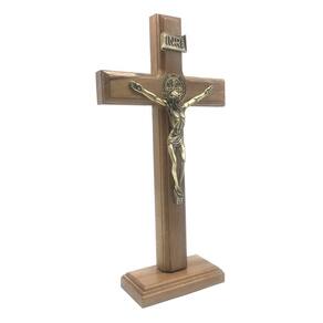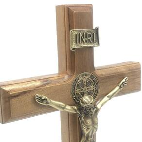 CRUCIFIXO DE MESA E PAREDE MADEIRA METAL SÃO BENTO OURO VELHO 26 CM