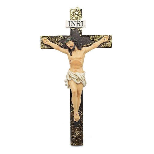 Crucifixo de Parede Importado Resina 25 cm A Cruz simboliza a glorificação de Cristo, um sinal de entrega de amor que possibilitou a nossa salvação. Dimensões: altura: 23 cm - Largura: 12 cm - Profundidade:4 cm Dimensões aproximadas do produto. Produto pintado a mão, podendo sofrer variações de cores. Marca: Amém Decoração Religiosa