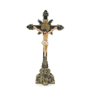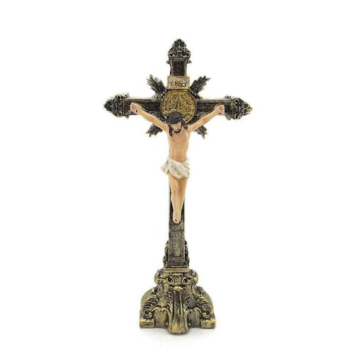 Crucifixo Pedestal Resina 20 cm A Cruz simboloza a glorificação de Cristo, um sinal de entrega de amor que possibilitou a nossa salvação. Dimensões: altura: 9 cm - Largura: 4 cm - Profundidade: 3 cm Dimensões aproximadas do produto. Produto pintado a mão, podendo sofrer variações de cores. Marca: Não Informado