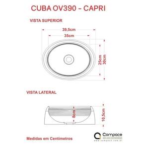 Sobre o ProdutoCuba de Apoio Oval Capri 39,5X30cm BrancaDescrição do ProdutoA cuba O39 Capri tem seu design tradicional, oval e um excelente escoamento de água, é fabricada em mármore sintético com acabamento em Gel Coat Polido, material bem semelhante a louça, muito resistente e mais econômico!!Itens Inclusos:1 Cuba de ApoioInformações Logísticas:Vol.01 - Comp.: 40cm - Prof.: 40cm - Alt.: 15,5cm - Peso Bruto: 4,8KgObservações:Não acompanha acessórios decorativos. Imagens meramente ilustrativas.Informações Técnicas / Características:- Cor: Branca- Marca: Compace- Modelo: CAOV390- Linha: Plus- Formato: Oval- Tipo de Cuba: Apoio- Material: Mármore Sintético- Acabamento: Gel Coat Polido- Escala de Brilho: Brilho- Possui Ladrão: Não- Possui Furação para Torneira: Não - Diâmetro do Furo para Válvula: (32mm) - DN 32 - Comprimento: 39,5cm- Largura: 30cm- Altura: 10,5cm - Peso Líq.: 4,5Kg- Recomendações de Uso, Manutenção e Limpeza: Utilize flanela seca ou pano macio, levemente umedecido com água. Evite contato com produtos químicos e abrasivos (solventes, thinner, acetona etc) e não utilize nenhum tipo de esponja de aço. Para maior brilho, recomendamos a utilização de cera automotiva n 2.- Necessita de Montagem: Sim / Acompanha Manual de Montagem- Complexidade da Montagem: Média: pode ser montado por mais de uma pessoa e/ou necessite de maior conhecimento para montagem.- Garantia: 6 meses Formato: Oval | Tipo de Cuba: Apoio | Material: Mármore Sintético | Acabamento: Hard Lacca PU | Escala de Brilho: Brilho | Possui Ladrão: Não | Possui Furação para Torneira: Sim | Diâmetro do Furo para Torneira: (32mm) - DN 32 | Diâmetro do Furo para Válvula: (32mm) - DN 32 | Limite de unidades por venda: É possível comprar até 1 unidade por venda. | Quantidade máxima de pedido: 1 | Baterias são necessárias?: false Cor: Branco