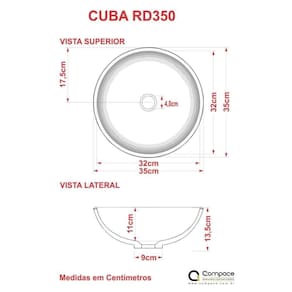 Cuba Apoio Redonda R35w Colorida Amarelo Sobre o ProdutoCuba de Apoio Redonda R35 35cm AmareloDescrição do ProdutoA cuba R35 tem seu design redondo e um excelente escoamento de água, é fabricada em mármore sintético com acabamento em Hard Lacca PU, material bem semelhante a louça, muito resistente e mais econômico!!Itens Inclusos:1 Cuba de ApoioInformações Logísticas:Vol.01 - Comp.: 38cm - Prof.: 38cm - Alt.: 17cm - Peso Bruto: 4,49KgObservações:Não acompanha acessórios decorativos. Imagens meramente ilustrativas.Informações Técnicas / Características:- Cor: Amarelo- Marca: Compace- Modelo: CARD350- Linha: Conect- Formato: Redonda- Tipo de Cuba: Apoio- Material: Mármore Sintético- Acabamento: Hard Lacca PU- Escala de Brilho: Brilho- Possui Ladrão: Não- Possui Furação para Torneira: Não - Diâmetro do Furo para Válvula: (40mm) - DN 40 - Comprimento: 35cm- Largura: 35cm- Altura: 13,5cm- Diâmetro: 35cm - Peso Líq.: 3,7Kg- Recomendações de Uso, Manutenção e Limpeza: Utilize flanela seca ou pano macio, levemente umedecido com água. Evite contato com produtos químicos e abrasivos (solventes, thinner, acetona etc) e não utilize nenhum tipo de esponja de aço. Para maior brilho, recomendamos a utilização de cera automotiva n 2.- Necessita de Montagem: Sim / Acompanha Manual de Montagem- Complexidade da Montagem: Média: pode ser montado por mais de uma pessoa e/ou necessite de maior conhecimento para montagem.- Garantia: 6 meses Formato: Redonda | Tipo de Cuba: Apoio | Material: Mármore Sintético | Acabamento: Hard Lacca PU | Escala de Brilho: Brilho | Possui Ladrão: Não | Possui Furação para Torneira: Não | Diâmetro do Furo para Torneira: 0 | Diâmetro do Furo para Válvula: (40mm) - DN 40 | Limite de unidades por venda: É possível comprar até 1 unidade por venda. | Quantidade máxima de pedido: 1 | Baterias são necessárias?: false Cor: Amarelo