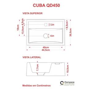 Sobre o ProdutoCuba de Apoio Retangular Q45 44,5X30,5cm AmareloDescrição do ProdutoA cuba Q45 tem seu design retangular, especial para pequenos espaços e um excelente escoamento de água, é fabricada em mármore sintético com acabamento em Hard Lacca PU, material bem semelhante a louça, muito resistente e mais econômico!!Itens Inclusos:1 Cuba de ApoioInformações Logísticas:Vol.01 - Comp.: 49cm - Prof.: 41cm - Alt.: 17,5cm - Peso Bruto: 5,7KgObservações:Não acompanha acessórios decorativos. Imagens meramente ilustrativas.Informações Técnicas / Características:- Cor: Amarelo- Marca: Compace- Modelo: CAQD450- Linha: Conect- Formato: Retangular- Tipo de Cuba: Apoio- Material: Mármore Sintético- Acabamento: Hard Lacca PU- Escala de Brilho: Brilho- Possui Ladrão: Não- Possui Furação para Torneira: Sim- Diâmetro do Furo para Torneira: (32mm) - DN 32- Diâmetro do Furo para Válvula: (40mm) - DN 40 - Comprimento: 44,5cm- Largura: 30,5cm- Altura: 10,5cm - Peso Líq.: 5,1Kg- Recomendações de Uso, Manutenção e Limpeza: Utilize flanela seca ou pano macio, levemente umedecido com água. Evite contato com produtos químicos e abrasivos (solventes, thinner, acetona etc) e não utilize nenhum tipo de esponja de aço. Para maior brilho, recomendamos a utilização de cera automotiva n 2.- Necessita de Montagem: Sim / Acompanha Manual de Montagem- Complexidade da Montagem: Média: pode ser montado por mais de uma pessoa e/ou necessite de maior conhecimento para montagem.- Garantia: 6 meses Formato: Retangular | Tipo de Cuba: Apoio | Material: Mármore Sintético | Acabamento: Hard Lacca PU | Escala de Brilho: Brilho | Possui Ladrão: Não | Possui Furação para Torneira: Sim | Diâmetro do Furo para Torneira: (32mm) - DN 32 | Diâmetro do Furo para Válvula: (40mm) - DN 40 | Limite de unidades por venda: É possível comprar até 1 unidade por venda. | Quantidade máxima de pedido: 1 | Baterias são necessárias?: false Cor: Cinza