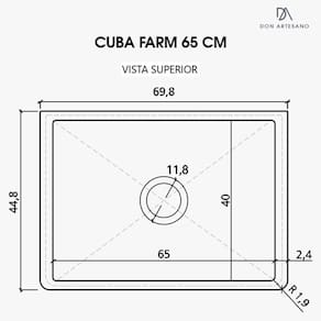 MARCA: DON ARTESANO LINHA: PREMIUM CÓDIGO SKU: FARM65 MATERIAL: SUPERFÍCIE SÓLIDA MINERAL DIMENSÕES EXTERNAS: 70 X 45 X 19,2 CM DIMENSÕES INTERNAS: 65 X 40 X 18 CM ESPESSURA: 1,2 CM ACABAMENTO: ACETINADO INSTALAÇÃO: SEMI-ENCAIXE OU EMBUTIR ANTI-RUÍDO: NO FUNDO E NAS LATERAIS FURAÇÃO DA VÁLVULA: 4 ½" (polegadas) ACEITA TRITURADOR: SIM PESO DA CUBA: 15,3 KG VOLUME: 46 L