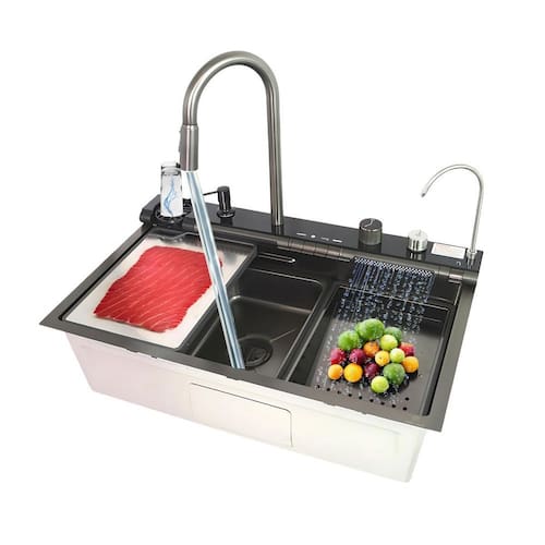 Esta cuba gourmet de cozinha em aço inox 304 é o ápice da modernidade e funcionalidade, projetada para quem valoriza praticidade e sofisticação. Com sistema automatizado toda comandada com botões, possui dois jatos de água em cascata para lavagem de louças e alimentos, adicionando um toque elegante ao design. Inclui um lavador de copos integrado para facilitar a limpeza de utensílios delicados, além de uma torneira com três tipos de jato, adaptando-se a diferentes necessidades de uso.