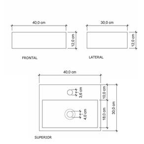 Características Gerais do Produto: - Altura: 26 cm - Garantia: Garantia de fábrica 3 meses - Largura: 40 cm - Marca: Venturi - Material da Cuba: Cuba em Pedra Ardósia com Pintura PU - Montagem Necessária?: Não - Peso: 11 kg - Profundidade: 30cm - Tipo de Instalação: De Sobrepor