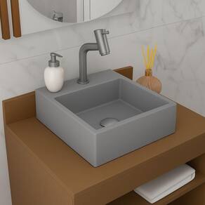 Cuba De Apoio Banheiro Topazio Pedra 35x35cm Chumbo Fosco Cuba de Apoio Banheiro Topazio Pedra 35x35 cm Chumbo Fosco - Cuba Topázio em Pedra Ardósia Gold 35x35cm Elegância e Resistência Produzida em Pedra Ardósia Gold, um material natural de alta durabilidade. Acabamento com Poliuretano (PU) e Verniz Alto Sólido para maior proteção. Design moderno e sem emendas, que facilita a limpeza e o escoamento da água. Medida de 35x35cm, ideal para banheiros, lavabos e espaços compactos. Superfície resistente, de fácil manutenção e longa durabilidade. Limpeza simples com detergente neutro e esponja macia. Evitar contato com produtos químicos e objetos pontiagudos. Garantia de 3 meses contra defeitos de fabricação. Produto que une beleza, praticidade e sofisticação para seu ambiente.
