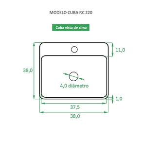 Cuba de Apoio Reno RC 220 - Quadrada Branca Nosso diferencial - Funcionários dentro da fábrica fazendo o controle de qualidade de nossos produtos. Cuba Quadrada Branca Semi Brilho. A tradicional cerâmica branca semi brilho com a modernidade das peças Reno Com mesa para torneira tradicional ou monocomando, amplo espaço de área molhada. Atenção: torneira e válvula NÃO inclusas ao produto. Vendemos à parte Confira. Feita para torneiras MONOCOMANDO ou tradicional não comporta bi comando Para torneira bica baixa É ideal para todo o tipo de banheiros e lavabos. Especificações do Produto: Marca - RENO Modelo - RC 220 Cor: Branca Acabamento: Semi Brilho Design: Quadrado Material: Cerâmica Produto - Marca Nacional : 3 anos - contra defeito de fabricação medidas: Comprimento: 38 cm Largura: 38 cm Altura: 13 cm Diâmetro: 4cm Limpeza: Orientamos que a limpeza seja feita com pano úmido, água e sabão neutro. Não deve ser utilizado produtos químicos e nem abrasivos, pois danificará a pintura da cuba. atenção: O transporte é de nossa responsabilidade e caso aconteça algum dano, enviaremos uma nova. VERIFIQUE o produto antes de efetuar a assinatura do canhoto de recebimento, a TROCA só será feira com a menção do cliente no conhecimento de transporte. Dúvidas a Banho&Casa estará à disposição para atendê-lo de segunda a sexta das 9:00 - 18:00 hrs. Marca: Não Informado