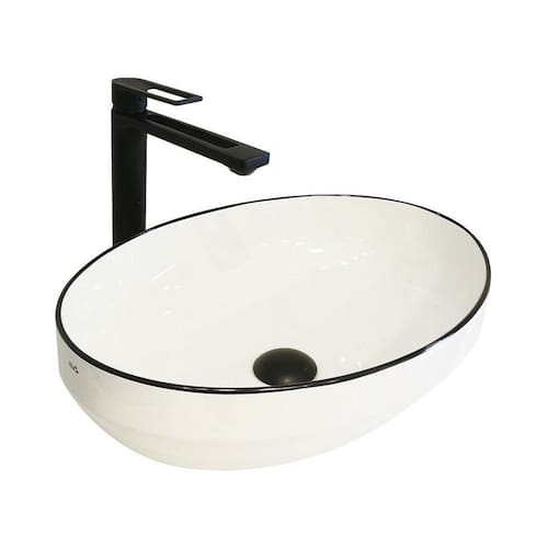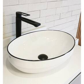 A escolha perfeita para elevar o estilo do seu banheiro Esta cuba cerâmica branca, com acabamento brilhante, apresenta um design oval com bordas finas e elegantes, conferindo sofisticação ao ambiente. Destaque para as bordas delicadamente contornadas por uma linha preta, adicionando um toque de luxo e exclusividade.