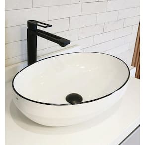 Cuba Oval Branca Semi Brilho com detalhe preto. A tradicional cerâmica branca semi brilho com a modernidade das peças Reno