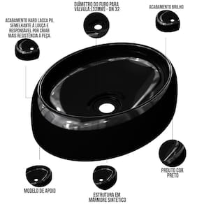 Cuba De Apoio Oval Para Banheiro Lavabo C01 Capri O39 Preto - Lyam Decor Seu banheiro de cara nova! Hoje, incrivelmente um dos locais da casa onde mais pedem decoração é o banheiro ou lavabo. Aqui apresentamos a você uma cuba elegante e de um escoamento de água excelente para proporcionar mais comodidade e versatilidade para os usuários do lavatório. Além de enriquecer o visual do seu banheiro, determina a funcionalidade do mesmo. Vale ressaltar que as torneiras mais indicadas para este tipo de cuba são as de parede ou de bica alta, e exige também uma bancada com espaço superior suficiente para abrigar a mesma, junto com os outros adornos de banheiro que você desejar. Ideal para fazer parte do seu sonho! Dimensões da Cuba (L x A x P) 39,5 x 10,5 x 30 cm Características: Estrutura em Mármore Sintético com acabamento Hard Lacca PU, semelhante a louça e responsável por criar mais resistência a peça. Acabamento Brilho. Furação da Cuba: Válvula Universal 7/8 (32mm). Formato: Oval. Modelo: Apoio Importante: O produto é enviado montado, requerendo apenas instalação por parte do cliente. Recomendação de Limpeza: Recomenda-se lavagem do produto com bucha apenas do lado amarelo e detergente neutro. Observações importantes: - Produto para uso residencial em ambiente interno, não devendo ficar exposto diretamente ao sol, calor e umidade excessivos. - Pode haver alguma diferença de tonalidade entre a imagem e o produto real, por conta do tratamento de imagens e a calibração de cores do seu monitor. - As imagens são meramente ilustrativas, não acompanham objetos de decoração e eletrônicos. - Ao receber a mercadoria, o cliente deve verificar as condições da embalagem, caso haja alguma não assine o de . - Montagem, desmontagem e outras instalações serão de responsabilidade do cliente. Não nos responsabilizamos, no ato da , por subir escadas/elevadores ou pelo por guincho em apartamentos. Eventuais despesas são de responsabilidade do comprador. - Confira as dimensões do produto e certifique-se de que passará normalmente por supostos elevadores, portas, escadas e/ou corredores de sua residência. NA