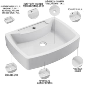 Cuba De Apoio Retangular Para Banheiro Lavabo C01 Rt50 Branco - Lyam Decor Seu banheiro de cara nova! Hoje, incrivelmente um dos locais da casa onde mais pedem decoração é o banheiro ou lavabo. Aqui apresentamos a você uma cuba elegante e de um escoamento de água excelente para proporcionar mais comodidade e versatilidade para os usuários do lavatório. Além de enriquecer o visual do seu banheiro, determina a funcionalidade do mesmo. Vale ressaltar que as torneiras mais indicadas para este tipo de cuba são as de parede ou de bica alta, e exige também uma bancada com espaço superior suficiente para abrigar a mesma, junto com os outros adornos de banheiro que você desejar. Ideal para fazer parte do seu sonho! Dimensões da Cuba (L x A x P) 50 x 10,5 x 37 cm Características: Estrutura em Mármore Sintético com acabamento Hard Lacca PU, semelhante a louça e responsável por criar mais resistência a peça. Acabamento Brilho. Furação da Cuba: Válvula Universal 7/8 (32mm). Formato: Retangular. Modelo: Apoio Importante: O produto é enviado montado, requerendo apenas instalação por parte do cliente. Recomendação de Limpeza: Recomenda-se lavagem do produto com bucha apenas do lado amarelo e detergente neutro. Observações importantes: - Produto para uso residencial em ambiente interno, não devendo ficar exposto diretamente ao sol, calor e umidade excessivos. - Pode haver alguma diferença de tonalidade entre a imagem e o produto real, por conta do tratamento de imagens e a calibração de cores do seu monitor. - As imagens são meramente ilustrativas, não acompanham objetos de decoração e eletrônicos. - Ao receber a mercadoria, o cliente deve verificar as condições da embalagem, caso haja alguma não assine o de . - Montagem, desmontagem e outras instalações serão de responsabilidade do cliente. Eventuais despesas são de responsabilidade do comprador. - Confira as dimensões do produto e certifique-se de que passará normalmente por supostos elevadores, portas, escadas e/ou corredores de sua residência. NA