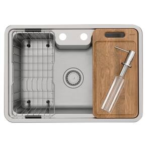 Seus acessórios exclusivos são opcionais: cesto escorredor aramado e tábua de corte em madeira teca que encaixam-se perfeitamente em ambos os lados da cuba, facilitando as tarefas do dia a dia; dispensador de detergente, prático e resistente, despeja a quantidade ideal do produto e resiste a 150 mil ciclos de funcionamento e lixeira com duas opções de tampa redonda ou quadrada.