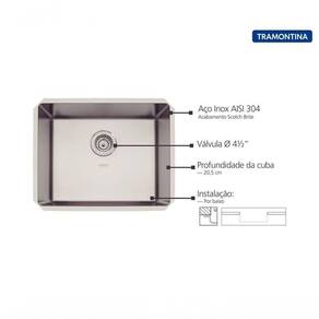 Antes do Uso: Remover a etiqueta colada na cuba. Limpar a pia com detergente neutro. Usar somente esponja macia ou pano para lavar.Modo de Uso: Não usar ácido muriático, água sanitária ou qualquer outro solvente para lavar objetos. Na reforma ou construção, proteger a pia para não deixar sobre a mesmo pó de cimento ou gesso. Enxaguar e secar bem a peça após o uso. Nunca deixar objetos metálicos sobre a peça por períodos muito longos, para evitar a corrosão. Para manter o brilho, recomenda-se o uso da pasta para polir e remover manchas em superfícies de aço inoxidável Tramontina.Esta peça contém bordas cortantes, manusear com cuidado.
