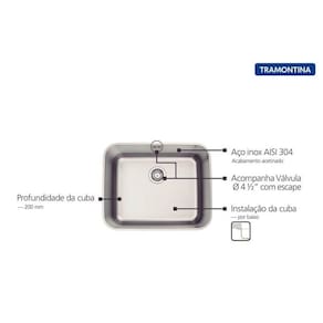 Aço Inox AISI 304 Instalação: Embutir Acabamento acetinado 0,8 mm de espessura Acompanha válvula de Ø 4 1/2" com escape. Profundidade da cuba 200 mm.
