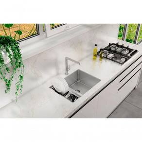 Atende a necessidade de utilizar menor espaço na bancada. O canal junto da cuba possibilita utilização de acessórios já inclusos, para melhor organização dos utensílios.