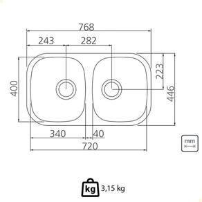 A cuba possui 15 cm de profundidade e capacidade de 17 + 17 litros, proporcionando amplo espaço para tarefas diárias e melhor aproveitamento do gabinete inferior.