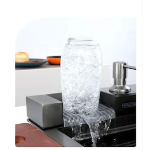 Agua em forma de cascata, para lavar a louça sem pressao e grande cobertura de fluxo de água.