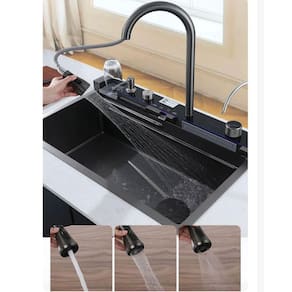Agua em forma de cascata, para lavar a louça sem pressao e grande cobertura de fluxo de água.