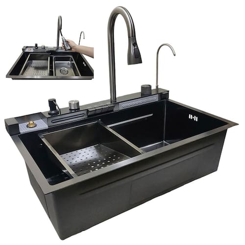 Água em forma de cascata, para lavar a louça sem pressão e grande cobertura de fluxo de água.