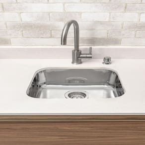A Cuba Lavínia 40 BL com bordas lisas para instalação por baixo da bancada e 17 cm de profundidade. Opcionalmente são oferecidos acessórios como, tábua em madeira, grade aramada, bandeja perfurada e cesta Quadrado.
