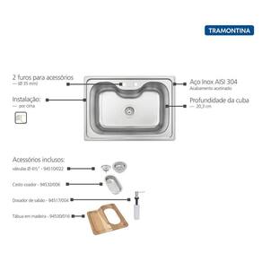A Cuba de Sobrepor Tramontina Morgana em Aço Inox com Acabamento Acetinado 69 x 49 cm com Válvula, Dosador de Sabão, Tábua e Cesto, da linha , é a escolha certa para acrescentar elegância e requinte ao projeto de sua cozinha. Produzida em aço inox, a cuba possui 20,3 cm de profundidade, garantindo maior facilidade aos afazeres diários. Acompanha válvula de 4 1/2 polegadas de diâmetro, dosador de sabão, tábua em madeira e cesto coador em inox.