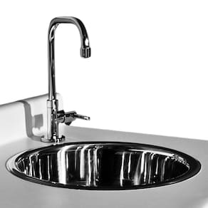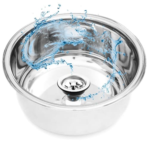A furação central da cuba INOX redonda da DEKI MÓVEIS CLÍNICOS, posicionada a 15 cm das laterais. Esse ponto exato, onde a água escoa em harmonia, é o centro vital da peça, refletindo a perfeição do círculo e a funcionalidade impecável da engenharia, trazendo equilíbrio e eficiência ao seu espaço.