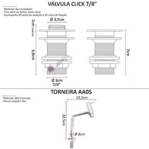 Modelo da válvula: Click Material da válvula: Aço Inoxidável Medidas da válvula: Altura aberta: 8 cm Altura fechada: 7 cm Diâmetro total: 5,5 cm Diâmetro da rosca: 3 cm - 7/8"