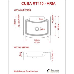 A cuba RT41 Aria tem seu design diferenciado e um excelente escoamento de água. Fabricada em mármore sintético com acabamento em Hard Lacca PU, material bem semelhante a louça, muito resistente e mais econômico! Acompanha Manual de Instalação: Não Altura: 9,5 cm Comprimento: 41 cm Cor: Cinza Cor do Produto: Cinza Diâmetro do furo: 32 mm Diâmetro para válvula: 40 mm Itens Inclusos: 1 Cuba Itens Inclusos: 1 Cuba Largura: 33,5 cm Manual de Montagem e Instalação: https://product-hub-prd.madeiramadeira.com.br/503865/documents/5066b881-b43a-4d71-bbcb-bc25f988b2dc3699instalaodecubasdeapoio.pdf Material Principal: Mármore Sintético Origem do Produto: Nacional Peso: 4,3 kg Possui furação para torneira: Sim Possui ladrão: Não Válvula indicada: Válvula: 1 1/4'' (40mm) Válvula oculta: Não Ean: 7893640087165
