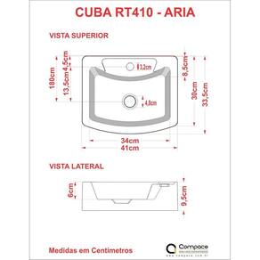 A cuba RT41 Aria tem seu design diferenciado e um excelente escoamento de água. Fabricada em mármore sintético com acabamento em Hard Lacca PU, material bem semelhante a louça, muito resistente e mais econômico! Acompanha Manual de Instalação: Não Altura: 9,5 cm Comprimento: 41 cm Cor: Vermelho Cor do Produto: Vermelho Diâmetro do furo: 32 mm Diâmetro para válvula: 40 mm Itens Inclusos: 1 Cuba Itens Inclusos: 1 Cuba Largura: 33,5 cm Manual de Montagem e Instalação: https://cdn2.madeiramadeira.com.br/atributo/compace/363699-instala-o-de-cubas-de-apoio.pdf Material Principal: Mármore Sintético Origem do Produto: Nacional Peso: 4,3 kg Possui furação para torneira: Sim Possui ladrão: Não Válvula indicada: Válvula: 1 1/4'' (40mm) Válvula oculta: Não Ean: 7893640087097