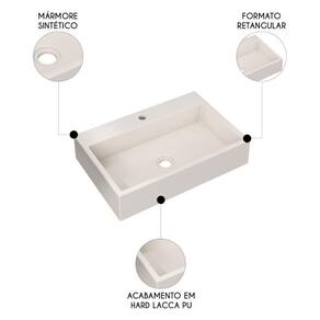 Fabricada em mármore sintético, um material composto por resina poliéster e carga mineral, com camada de Gel Coat e acabamento de pintura poliéster PU, ela é bastante semelhante à louça, porém mais econômica. A Cuba de Apoio combina resistência e durabilidade, além de já vir com furação para torneira, o que torna a instalação ainda mais prática. O acabamento em Hard Lacca PU garante brilho e proteção, proporcionando um visual sofisticado e fácil de manter.