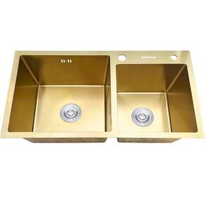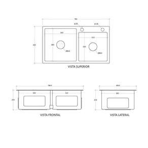 Material Predominante: Aço inoxidável 201 Espessura: 3 mm externo e 1mm interno Acabamento: Nano Tecnologia Medidas internas cuba grande: 39x38x20 cm Medidas internas cuba pequena:31x33x20 cm Medidas externas: 43x78x20 cm Aplicação: Embutir ou Sobrepor Posição da Válvula: Centralizada Furação da Válvula: 4.1/2 Válvula Escape/Ladrão: Sim Indicação: Cozinha, Ilha, Área Gourmet Aceita Triturador: Sim Anti-ruído: Sim Fundo e laterais Acompanha Acessórios: Sim Sifão: Sim