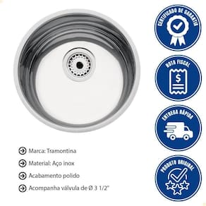 - Fabricada em Aço Inox 304, com 0,6 mm de espessura e acabamento polido, oferece durabilidade e resistência, a Cuba redonda possui bordas lisas para instalação por baixo da bancada e 14 cm de profundidade.