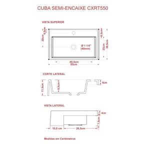 Cuba Semi Encaixe Retangular Xrt55w Colorida Verde Acqua Sobre o ProdutoCuba de Apoio Retangular XRT55 54X36,5cm AmareloDescrição do ProdutoA cuba de Semi Encaixe XRT55 tem seu design retangular e um excelente escoamento de água, é fabricada em mármore sintético com acabamento em Hard Lacca PU, material bem semelhante a louça, muito resistente e mais econômico!!Itens Inclusos:1 Cuba de ApoioInformações Logísticas:Vol.01 - Comp.: 61cm - Prof.: 43cm - Alt.: 17cm - Peso Bruto: 8,1KgObservações:Não acompanha acessórios decorativos. Imagens meramente ilustrativas.Informações Técnicas / Características:- Cor: Amarelo- Marca: Compace- Modelo: CAXRT550- Linha: Conect- Formato: Retangular- Tipo de Cuba: Semi-Encaixe- Material: Mármore Sintético- Acabamento: Hard Lacca PU- Escala de Brilho: Brilho- Possui Ladrão: Não- Possui Furação para Torneira: Sim- Diâmetro do Furo para Torneira: (32mm) - DN 32- Diâmetro do Furo para Válvula: (40mm) - DN 40 - Comprimento: 54cm- Largura: 36,5cm- Altura: 11,5cm - Peso Líq.: 7,4Kg- Recomendações de Uso, Manutenção e Limpeza: Utilize flanela seca ou pano macio, levemente umedecido com água. Evite contato com produtos químicos e abrasivos (solventes, thinner, acetona etc) e não utilize nenhum tipo de esponja de aço. Para maior brilho, recomendamos a utilização de cera automotiva n 2.- Necessita de Montagem: Sim / Acompanha Manual de Montagem- Complexidade da Montagem: Média: pode ser montado por mais de uma pessoa e/ou necessite de maior conhecimento para montagem.- Garantia: 6 meses Formato: Retangular | Tipo de Cuba: Semi-Encaixe | Material: Mármore Sintético | Acabamento: Hard Lacca PU | Escala de Brilho: Brilho | Possui Ladrão: Não | Possui Furação para Torneira: Sim | Diâmetro do Furo para Torneira: (32mm) - DN 45 | Diâmetro do Furo para Válvula: (40mm) - DN 53 | Limite de unidades por venda: É possível comprar até 1 unidade por venda. | Quantidade máxima de pedido: 1 | Baterias são necessárias?: false Cor: Verde Acqua