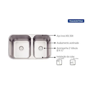 Cuba Tramontina fabricada em Aço Inox com 0,7 mm de espessura e acabamento acetinado Aço Inox AISI 304 Instalação: Embutir ou sobrepor Acabamento: Acetinado Espessura: 0,7 mm Profundidade da cuba: 140 mm Capacidade: 16 + 12,5 L Acompanham 2 válvulas de Ø 4 1/2" Manta adesiva anti-ruído: sim Todas as imagens são meramente ilustrativas. Ean: 7894693053978