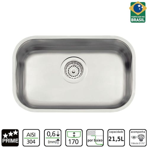 As cubas são sinônimos de funcionalidade e requinte para a sua casa. A Cuba Lavínia 47 BL Tramontina Prime em Aço Inox Acetinado 47x30 cm é fabricada em Aço Inox 304, com 0,6 mm de espessura e acabamento acetinado, oferecendo durabilidade e resistência. Produzida com bordas lisas para instalação por baixo da bancada, possui 17 cm de profundidade. Opcionalmente é oferecido como acessório a grade aramada para o fundo da cuba. A Tramontina oferece produtos de qualidade superior para mercados que buscam alto desempenho funcional e qualidade comprovada.