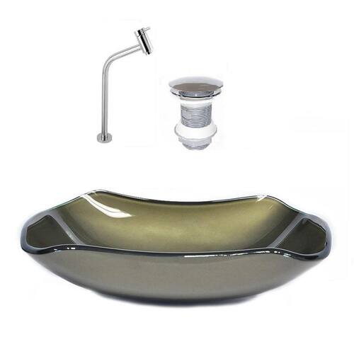 Cuba de vidro abaulada 51cm ouro envelhecido + valvula + torneira As nossas cubas de vidro são ideais para projetos de decoração em banheiros com alto padrão e bom gosto, pois proporcionam um efeito moderno e único ao ambiente,são instaladas sobre a bancada e por isso realçam com destaque o acabamento do seu banheiro, sem contar a eficiência e praticidade que se leva para a sua casa. O vidro é pintados com tinta de alta performance, o que lhe garante a permanência da cor . Dados técnicos Formato: retangular abaulada Material: vidro Instalação: apoio ou sobrepor. Dimensões: 51x39x15cm comprimento x profundidade x altura Espessura: 10mm Dados técnicos da válvula: Formato: redonda; Material: polipropileno; Instalação: cubas, tanques e lavatórios; Diâmetro: 1.1/4 polegadas. Dados técnicos da torneira: Material: liga metálica cromada; Conexão de entrada: 1/2 polegada -1/4 volta; Altura total da torneira: 37 cm; Altura da queda dágua: 27 cm. : 12 meses conforme política de troca e devoluções . Atenção: preço referente a cuba, válvula click e torneira de metal cromada. Montagem: montagem e instalação não inclusa na venda ou preço do produto, elas são de inteira responsabilidade do cliente. Imagens ilustrativas.