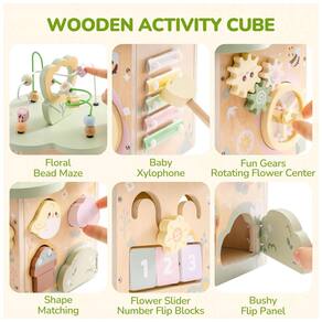 MERGULHE EM UMA AVENTURA DE TEMPO DE BRINCADEIRA SEM FIM com este cubo de atividades de 4 lados, apresentando 7 áreas interativas que incentivam a exploração, aprendizado e crescimento. De deslizadores de flores e encaixe de formas a engrenagens giratórias e contas de contagem, cada lado oferece atividades emocionantes para o seu pequeno. INSPIRADO EM UM JARDIM CHEIO DE FLORES, este cubo de atividades apresenta flores fofas, pássaros amigáveis, abelhas zumbindo e muito mais. As cores suaves e pastéis criam um espaço tranquilo e acolhedor para o seu bebê explorar e aproveitar. ESTIMULA A EXPLORAÇÃO E A CRIATIVIDADE com recursos envolventes como o centro de flores giratório, blocos deslizantes e sinos musicais, este cubo de atividades incentiva as pequenas mãos a explorar, aprimorando habilidades cognitivas, capacidades de resolução de problemas e criatividade. Perfeito para promover a aprendizagem precoce e o desenvolvimento intelectual, proporcionando diversão sem fim. DESIGN SEGURO E DURÁVEL feito de madeira premium e revestido com material não tóxico, este cubo de atividades é liso, durável e possui bordas arredondadas para maior segurança. Não requer montagem - basta abrir a tampa para facilitar o uso, e permanece estável sem balançar, garantindo uma experiência segura para crianças a partir de 1 ano. UM PRESENTE PARA GUARDAR seja para aniversários, feriados ou chás de bebê, este cubo de atividades lindamente trabalhado é o presente perfeito para pequenos aprendizes. Amado por crianças e pais, é uma mistura de diversão e educação que eles irão estimar!