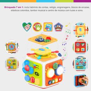 - Brinquedo 7 em 1: inclui labirinto de contas, relógio, engrenagens, blocos de encaixe, elásticos coloridos, tambor musical e centro de música com luzes e sons.