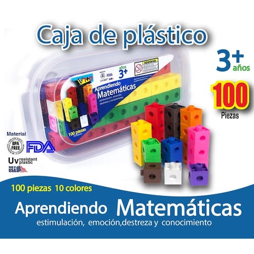 100 cubos conectores multiencaje unifix encajables en CAJA DE PLASTICOCubos conectables, para aprender matemática, al ser encajable pueden hacer formas en las cuales pueden sumar y jugar al mismo tiempoArma, crea, aprende de manera didáctica, concreta y pictórica.Encajan muy bien, no se desarman, material de boa qualidade! CUBOS CONECTORES10 cores de cada unoIcos Cubos fabricados 100% no Chile.Material atóxico certificado pela FDA USA