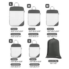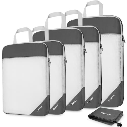 Gonex Organizadores de malha de compressão 1L + 2M + 2S + saco de lavanderia cinza - O conjunto inclui: 1 x grande (41 x 29,5 x 9,9 cm), 2 x médio (33,5 x 23,5 x 9,9 cm), 2 * pequeno (29,5 x 21 x 9,9 cm) e 1 * saco de roupa (46 x 33 cm) - Material macio: O poliéster ultra macio e leve com alta densidade e extensibilidade e zíper suave tornam este conjunto de cubos de compressão extremamente durável quando é preenchido com mais itens essenciais. - Revolucionou sua embalagem: nossos organizadores facilitam a embalagem e reduzem drasticamente o espaço necessário para viagens. Chega de embalar! - Economia de espaço: zíperes duplos do cubo de embalagem funcionam perfeitamente na compressão de roupas para ajudar a economizar espaço em sua bagagem de mão ou mochila de viagem. Ótimo equipamento de viagem para minimizar o tamanho da sua bagagem de mão. Alça rápida para fácil acesso a retirar cubos embalados da mala ou mochila. - Adequado para todas as ocasiões: ideal para férias em família, viagens de negócios, acampamento ao ar livre e armazenamento diário.