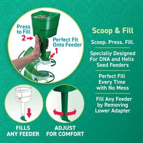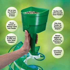 Cuchara para semillas Cascade® con botón para liberar semillas a través del pico; construcción duradera. - Coge tus semillas, ajusta el pico a la abertura de tu comedero, presiona el botón para liberar las semillas dentro del comedero. - Diseñada especialmente para los comederos Cascade DNA y Helix para un llenado perfecto en cada ocasión. - Llena cualquier comedero que tengas simplemente quitando el adaptador inferior. - Gran regalo para todas las edades. Ideal para maestros, jubilados y personas mayores que disfrutan de los comederos. - Construida con resinas estabilizadas contra rayos UV; diseño y soporte al cliente en EE.UU. - Diseñado y vendido solo en EE.UU. por Ideam LLC; soporte al cliente basado en EE.UU.; negocio familiar pequeño.