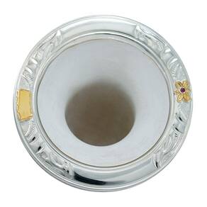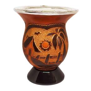 Descrição: Cuia com bocal de prata, cinzelado de folhas, 01 chapinha de ouro e 01 flor de ouro. Base em Pedra O porongo é um produto natural (fruto lenhoso): o formato, tamanho, tonalidades de cores são variáveis. Eventualmente algumas marcas naturais fazem parte do produto.